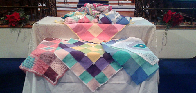 During the service, ten blankets were presented as Baby Baptism Gifts. These had been assembled from squares, knitted and crocheted by members of MU-inspired “Knit and Knatter for Charity”, and by others.